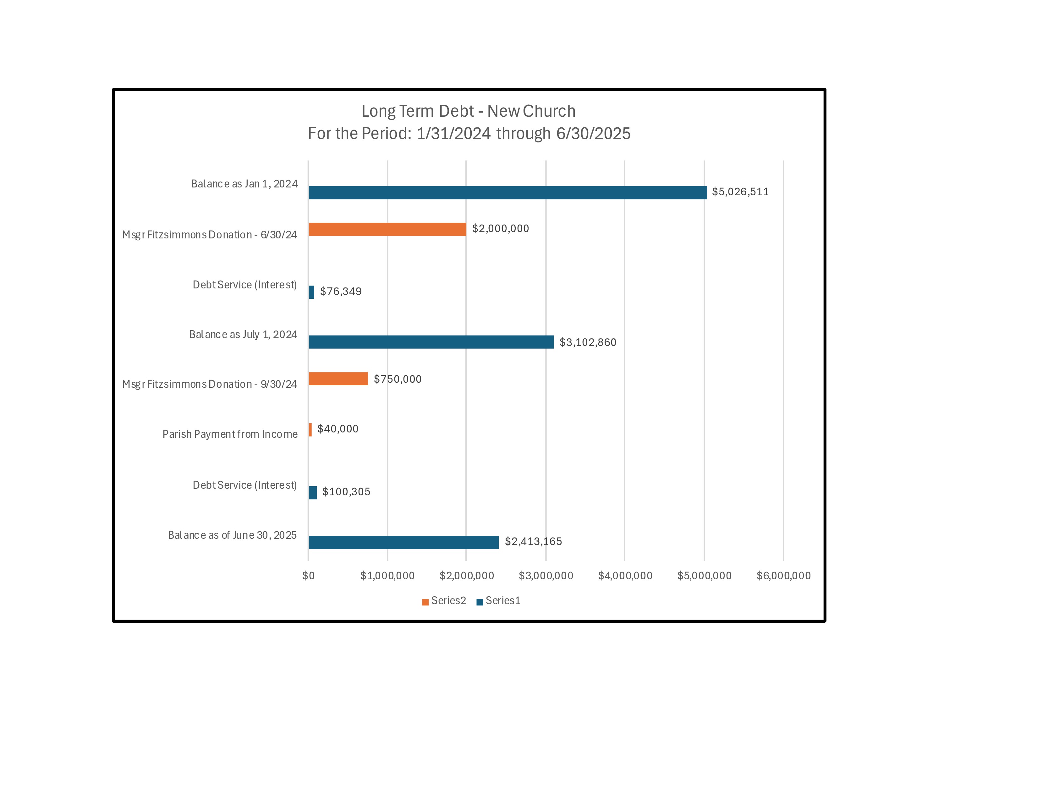 the parish has made payments in the amount $1,595,879 bringing the balance down to $5,026,511 on January 1, 2024. Since that time the debt has been further reduced by parish payments and by the large bequest of $2,750,00 by Monsignor Thomas Fitzsimmons. As shown on the chart, the current loan balance is $2,413,165.