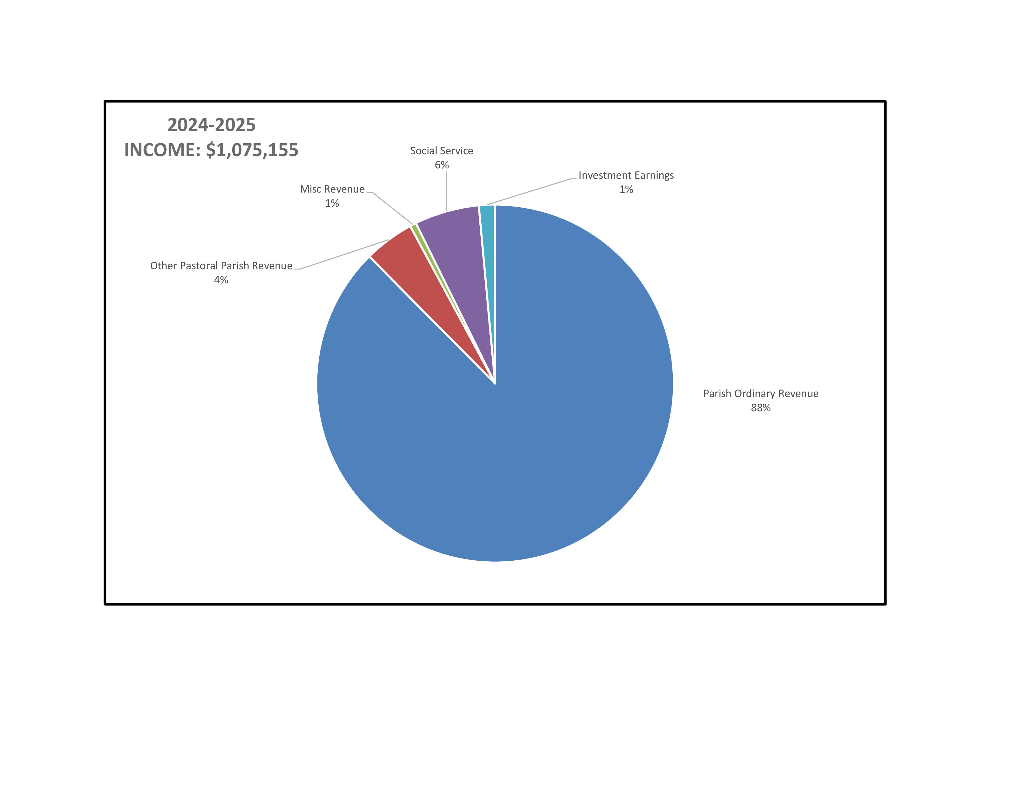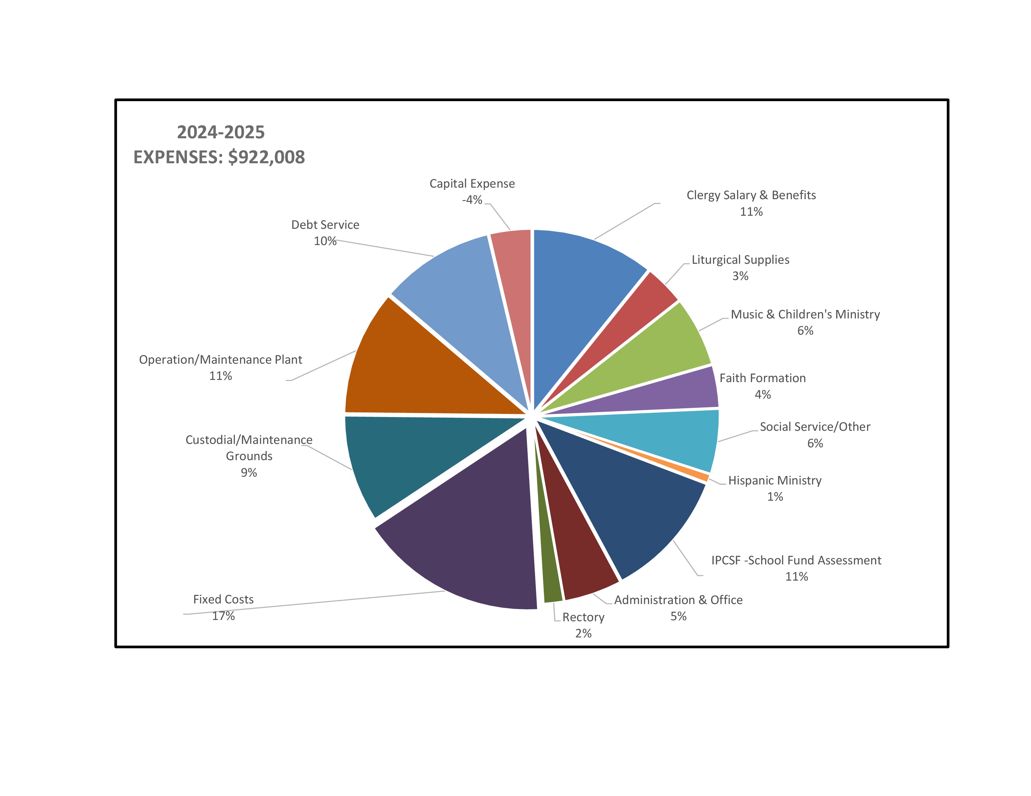 The actual income/expenses for 2024-25 are provided for the fiscal year just ended on June 30. Take note that 88% of our income comes from the first collection. Fixed costs, debt service, and diocesan assessments account for 38% of spending and 20% was used for the operation of the plant, custodial, and maintenance of the grounds. See the charts for more specifics. Should you have any questions, please ask me, a member of the Finance Council or one of the Trustees.
